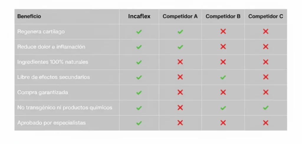 Incaflex no contiene aditivos nocivos, ingredientes transgénicos ni sintéticos, por lo que es una opción segura para quienes desean tomar el control de su salud articular y volver a moverse con libertad y bienestar.