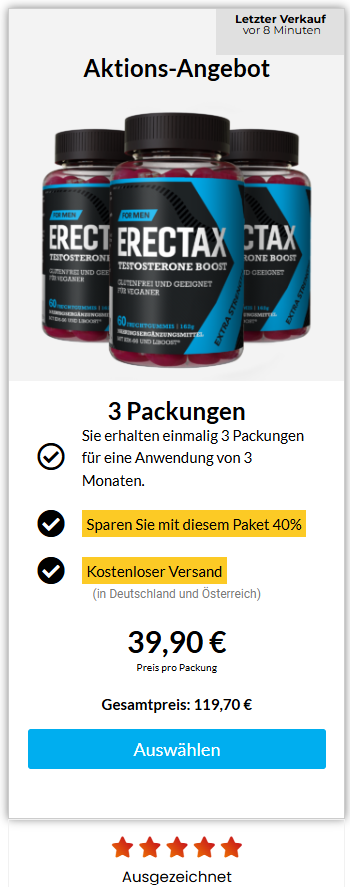 Zu diesem Zeitpunkt können Sie das Nahrungsergänzungsmittel Erectax für 60% RABATT + KOSTENLOSEN Versand bestellen. Dies ist ein zeitlich begrenztes Angebot und wird nicht lange verfügbar sein.